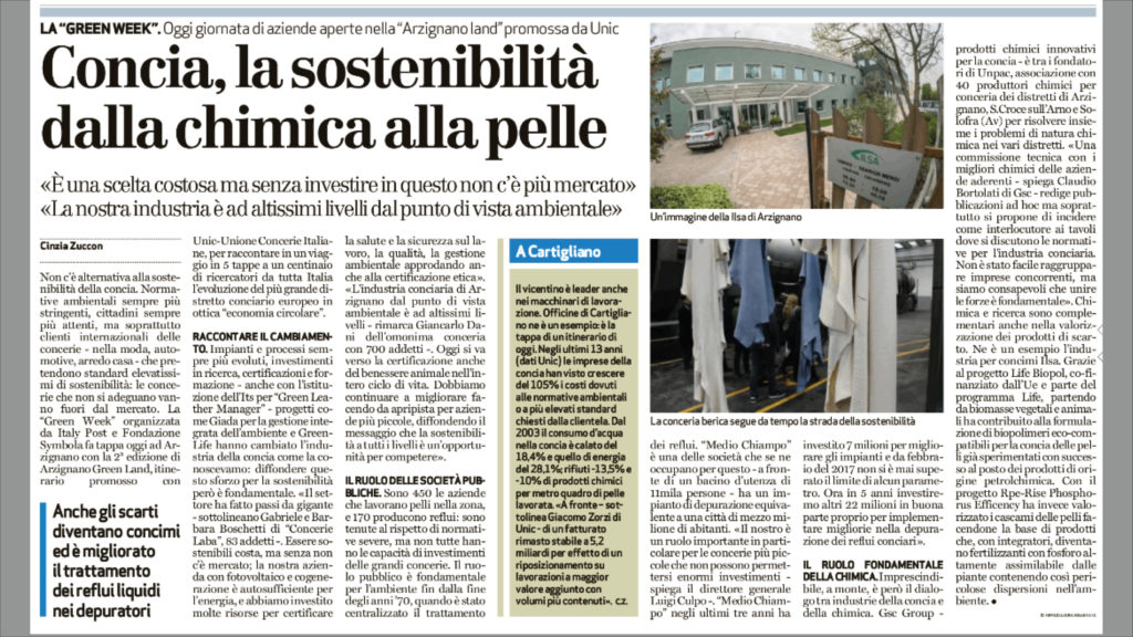 La “Green Week” organizzata da Italy Post e Fondazione Symbola fa tappa oggi ad Arzignano con la 2a edizione di Arzignano Green Land, itinerario promosso con Unic-Unione Concerie Italiane, per raccontare in un viaggio in 5 tappe a un centinaio di ricercatori da tutta Italia l’evoluzione del più grande distretto conciario europeo in ottica “economia circolare”.