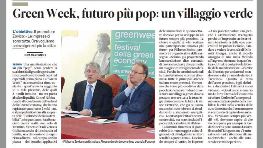 Una manifestazione che sia più “pop”, senza perdere la sua identità di grande agorà scientifica con il contributo di ospiti ed esperti di primo piano. La “Green Week” sta crescendo a ritmo costante – quest’anno ha raggiunto le 15 mila presenze, delle quali 3-4 mila trentine – ma ora punta al salto di qualità. Come? Abbinando alle conferenze del Festival della Green Economy, che hanno registrato quasi tutte il sold-out, e al propedeutico tour alla scoperta delle “Fabbriche della Sostenibilità”, che quest’anno ha abbracciato trenta realtà non solo di Trentino, Veneto e Friuli Venezia Giulia ma anche di Lombardia ed Emilia, una dimensione di esperienza diretta – sul campo, anzi in piazza – dei benefici applicativi delle innovazioni in questo settore decisivo per lo sviluppo in un futuro sempre più prossimo.