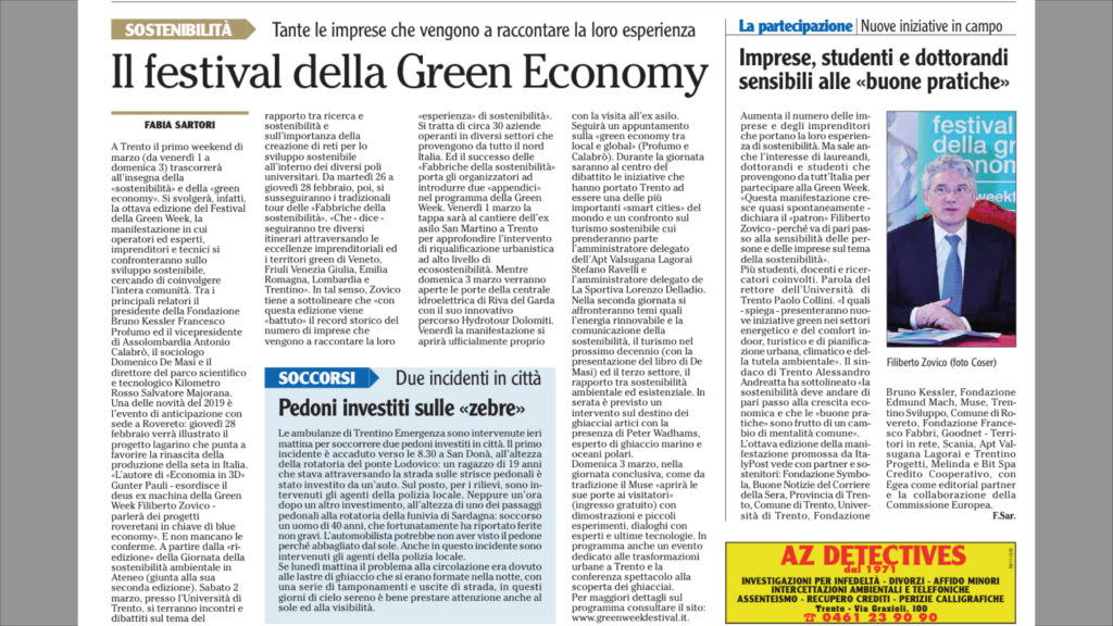 Tra i principali relatori il presidente della Fondazione Bruno Kessler Francesco Profumo ed il vicepresidente di Assolombardia Antonio Calabrò, il sociologo Domenico De Masi e il direttore del parco scientifico e tecnologico Kilometro Rosso Salvatore Majorana. Una delle novità del 2019 è l’evento di anticipazione con sede a Rovereto: giovedì 28 febbraio verrà illustrato il progetto lagarino che punta a favorire la rinascita della produzione della seta in Italia. «L’autore di «Economia in 3D» Gunter Pauli – esordisce il deus ex machina della Green Week Filiberto Zovico – parlerà dei progetti roveretani in chiave di blue economy».
