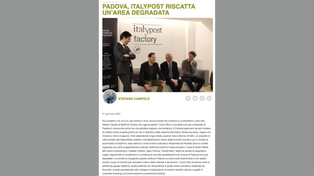 Inevitabilmente il valore degli immobili scende e qui si innesta la scommessa di ItalyPost, casa editrice e ormai motore culturale e relazionale del Nordest dove la società organizza una serie di appuntamenti culturali, festival ed eventi (il mese prossimo ci sarà la Green Week, altri eventi comprendono il Galileo Festiva, Open Factory, Trieste Next). ItalyPost decide di espandersi, coglie l’opportunità di investimento e contribuisce così alla riqualificazione di un’area di Padova tra le più degradate. La società ha inaugurato questa mattina a Padova la nuova sede trasformata in uno spazio eventi e luogo di incontro per discutere il futuro delle imprese e dei territori. I nuovi uffici riuniscono tutte le attività del gruppo ItalyPost, quelle editoriali con VeneziePost e quelle rivolte al territorio realizzate da Goodnet, società specializzata nello sviluppo e realizzazione di eventi e festival culturali, progetti di corporate branding e di comunicazione e promozione turistica.
