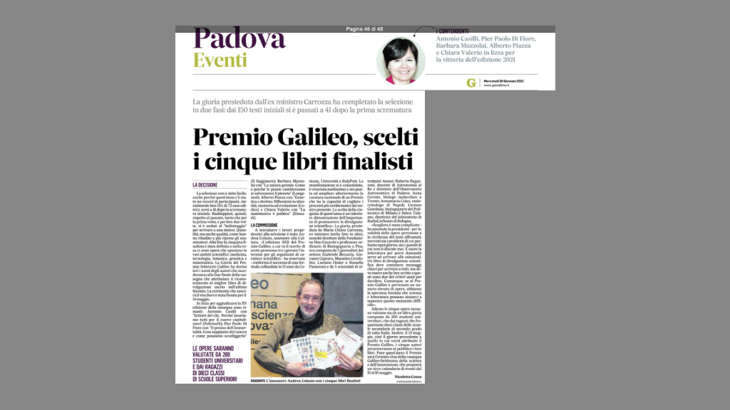 LA COMMISSIONE. A introdurre i lavori propedeutici alla selezione è stato Andrea Colasio, assessore alla Cultura. «L’edizione 2021 del Premio Galileo, a cui va il merito di avere promosso tra i giovani l’interesse per gli argomenti di carattere scientifico – ha osservato – conferma il successo di una formula collaudata in 15 anni da Comune, Università e ItalyPost. La manifestazione si è consolidata, è cresciuta moltissimo e ora punta ad ampliare ulteriormente la caratura nazionale di un Premio che ha la capacità di cogliere i processi più emblematici del nostro presente. La scelta della cinquina di quest’anno è un’ulteriore dimostrazione dell’importanza di promuovere la divulgazione scientifica». La giuria, presieduta da Maria Chiara Carrozza, ex ministro (nella foto in alto), nonché direttore della Fondazione Don Gnocchi e professore ordinario di Bioingegneria a Pisa, era composta da 5 giornalisti del settore (Gabriele Beccaria, Giovanni Caprara, Massimo Cerofolini, Luciano Onder e Rossella Panarese) e da 5 scienziati di altrettanti Atenei: Roberto Ragazzoni, docente di Astronomia al Bo e direttore dell’Osservatorio Astronomico di Padova; Anna Ceresto, biologo molecolare a Trento; Annamaria Colao, endocrinologo di Napoli ; Carmen Giordano, bioingegnere del Politecnico di Milano e Sahra Talamo, direttrice del laboratorio di RadioCarbonio di Bologna.